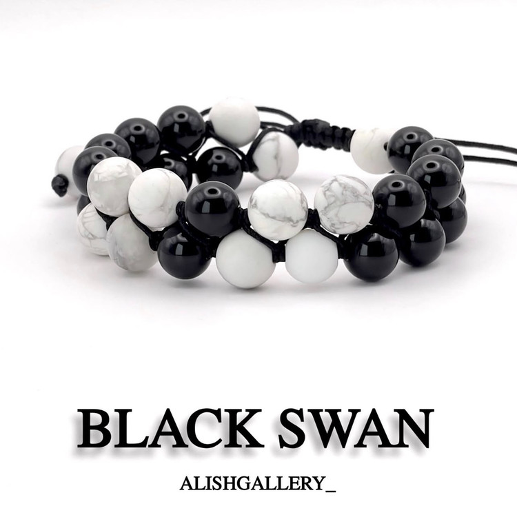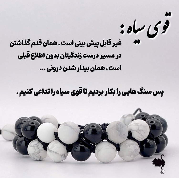 دستبند «قوی سیاه» یک نمونه کلاسیک از تعادل است. ما معمولاً ترکیب سنگهای سیاه و سفید را زیاد میبینیم، اما نکته متمایز این طراحی در ساختار دو ردیفه آن است. این ساختار باعث میشود تماس سنگ با پوست مچ دست (که محل عبور جریان خون و انرژی است) دو برابر شود.